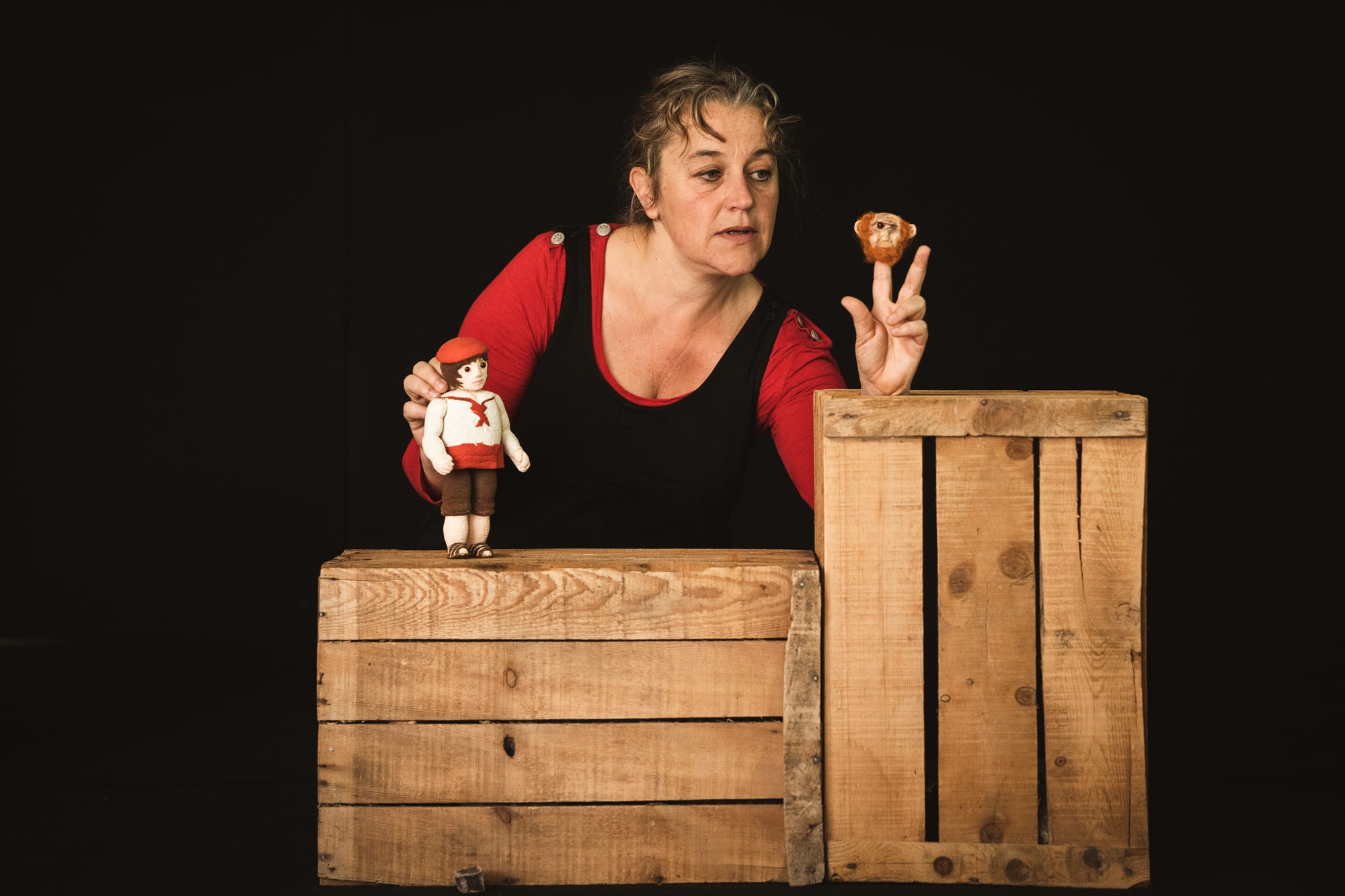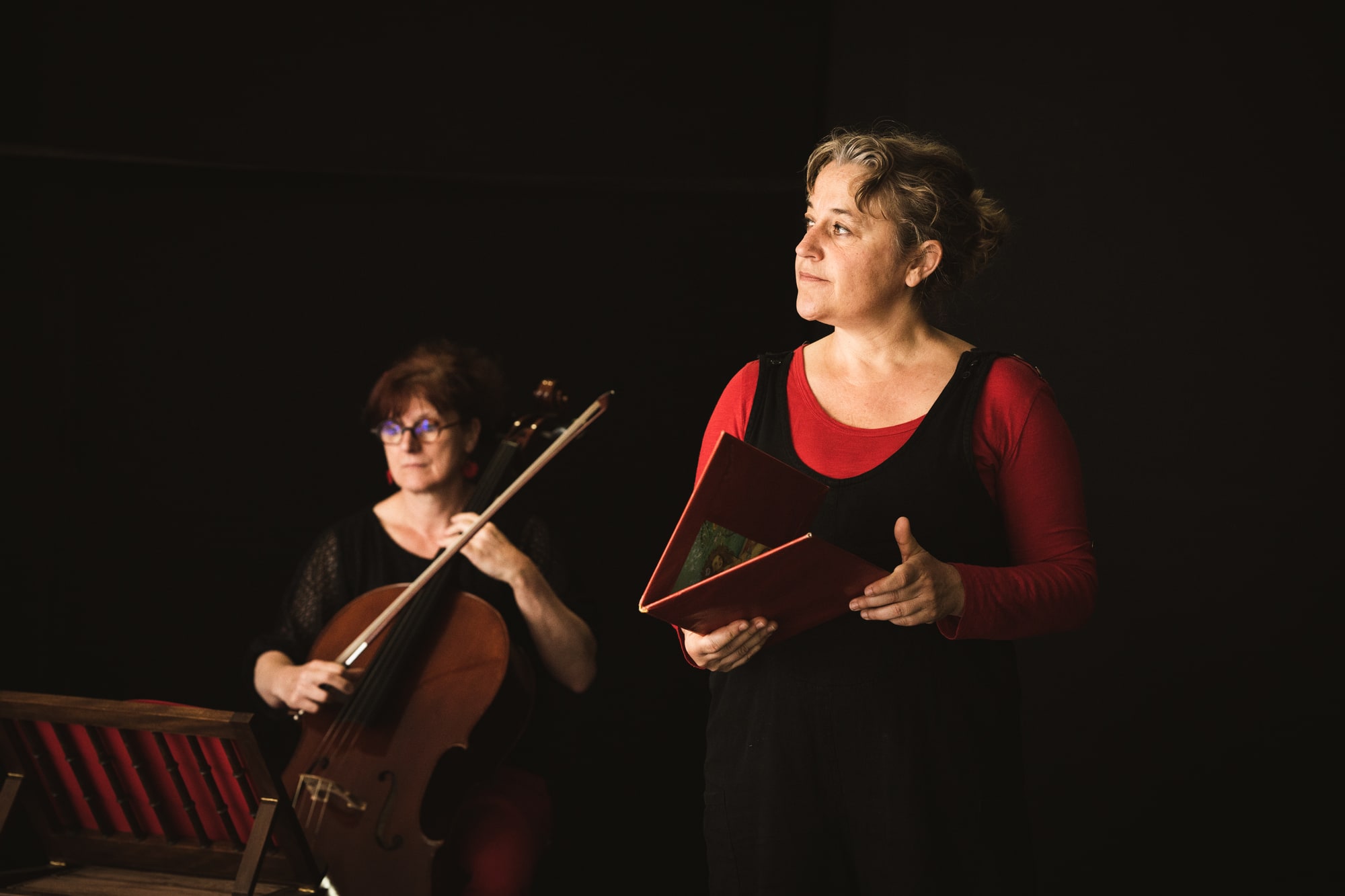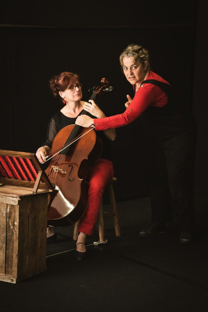 La conteuse, manipulatrice est accompagnée par une violoncelliste qui rythme et accompagne suspens et actions de son archet et de ses cordes.