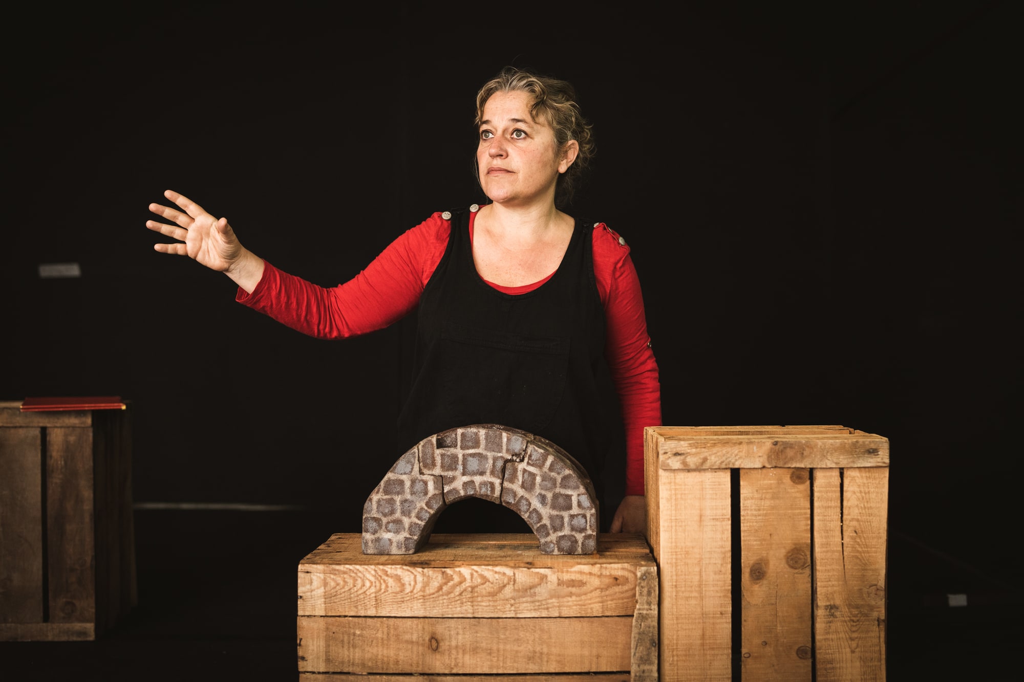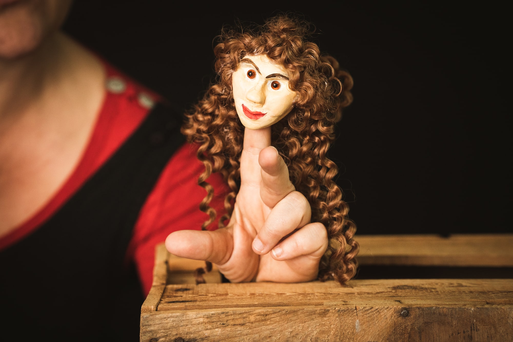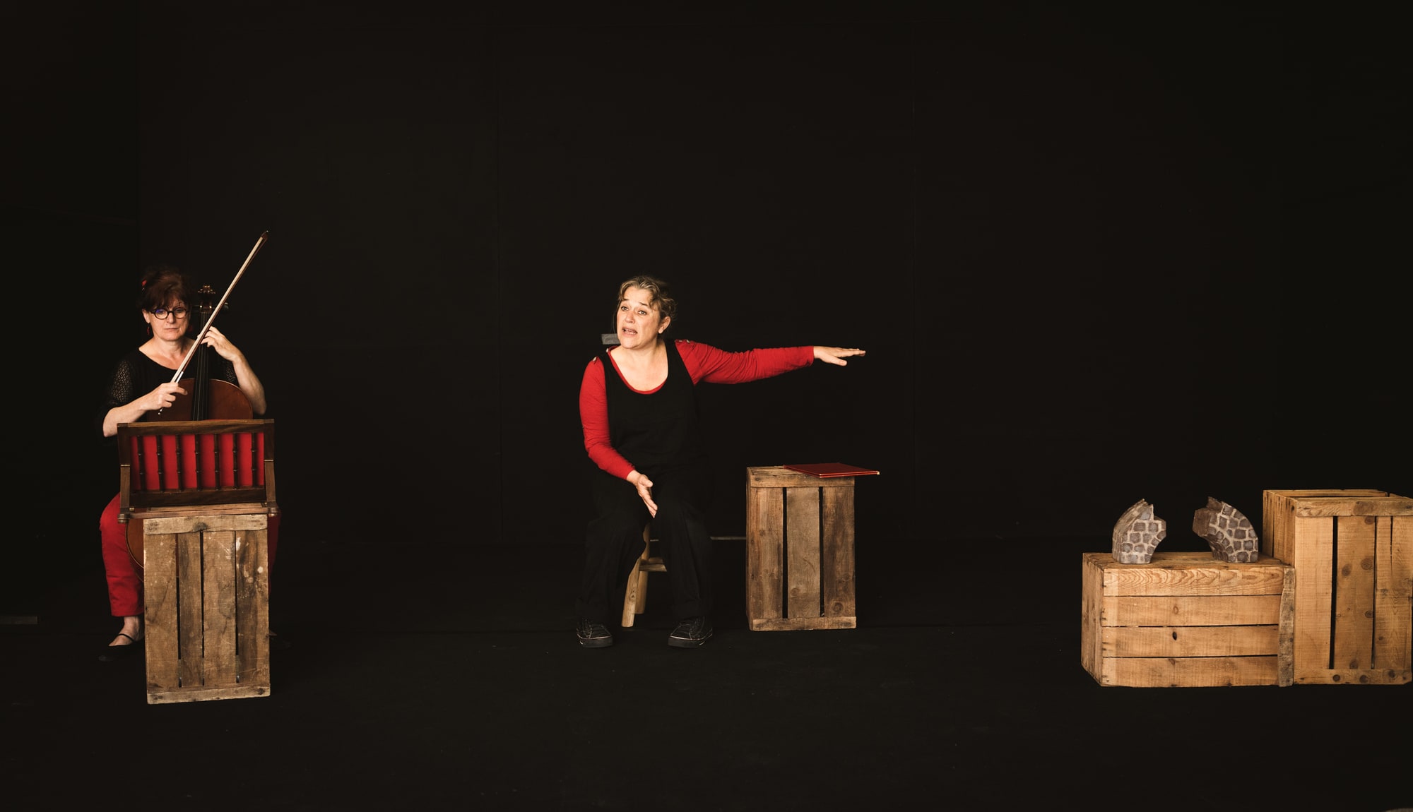 La conteuse, manipulatrice est accompagnée par une violoncelliste qui rythme et accompagne suspens et actions de son archet et de ses cordes.