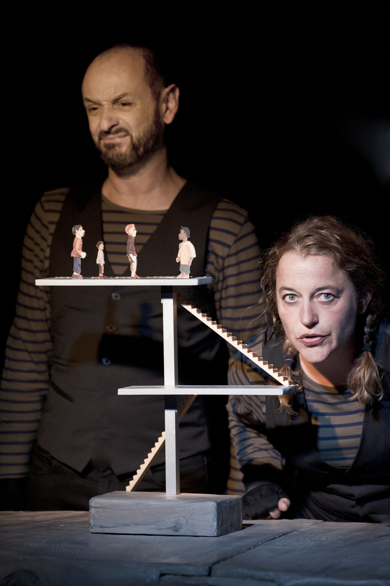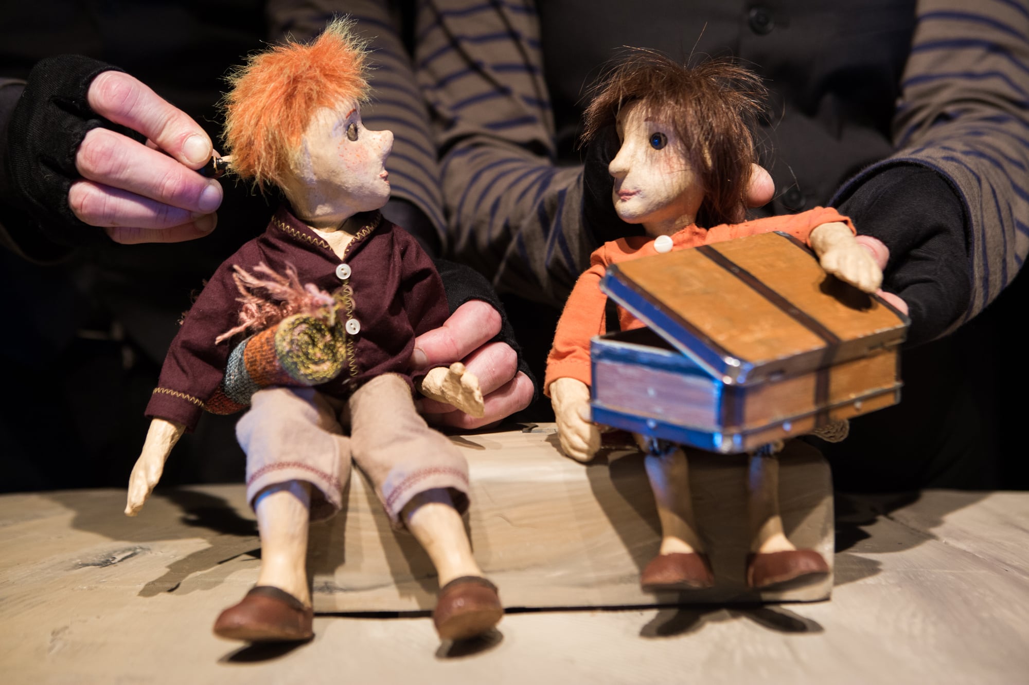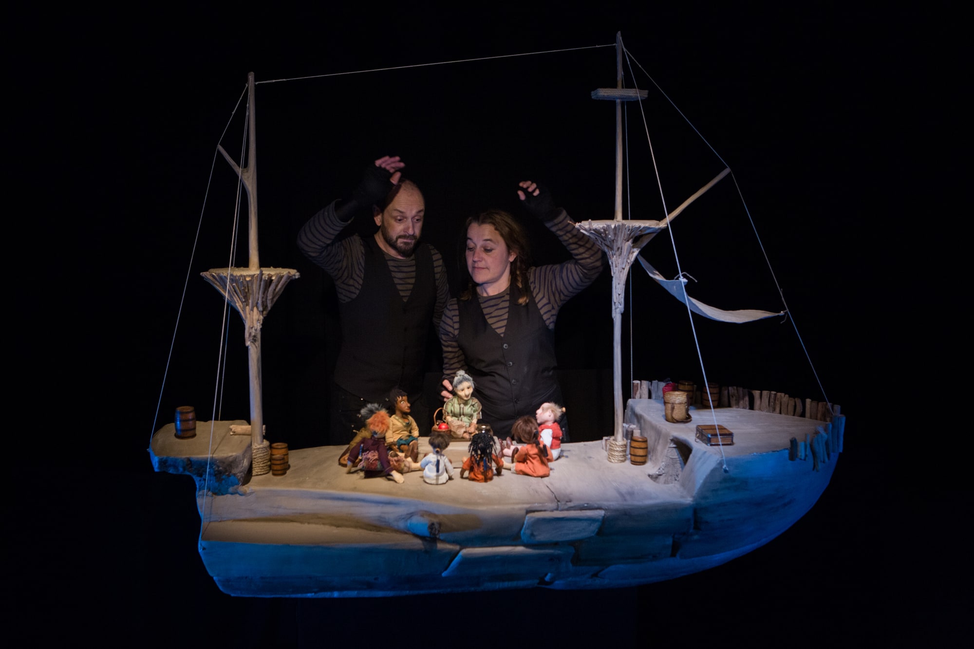 Les marionnettes, personnages embarquées pour la traversée, sont manipulées à vue, selon le principe de la « manipulation sur table ».